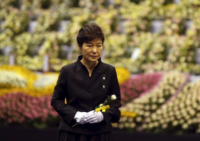 4月29日,韩国安山,韩国总统朴槿惠前往位于安山的灵堂,向“岁月”号客轮沉没事故死难者献花。