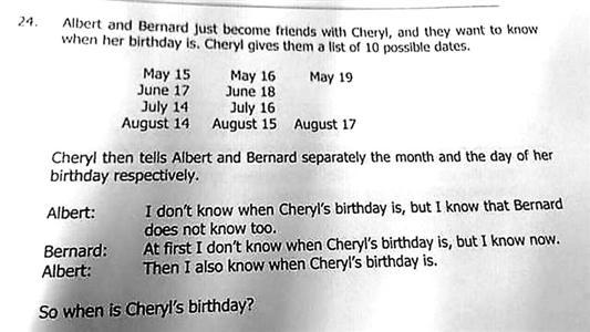 这道数学题意在考察学生逻辑推理能力,情节设定是:阿尔贝茨、贝尔纳德这两个小伙子想要知道谢丽尔姑娘的生日,于是谢丽尔给了他俩10个日期,然后分别悄悄向两人透露了月和日的确切信息。题目要求学生们通过分析两个小伙子的几句对话,最终推理出谢丽尔的生日。