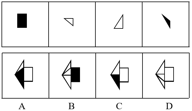 左边四张纸片,每张纸片一面是黑色,另一面是白色,右边仅有一项能由其拼合(可以平移、旋转、翻转)而成,请把它找出来。
