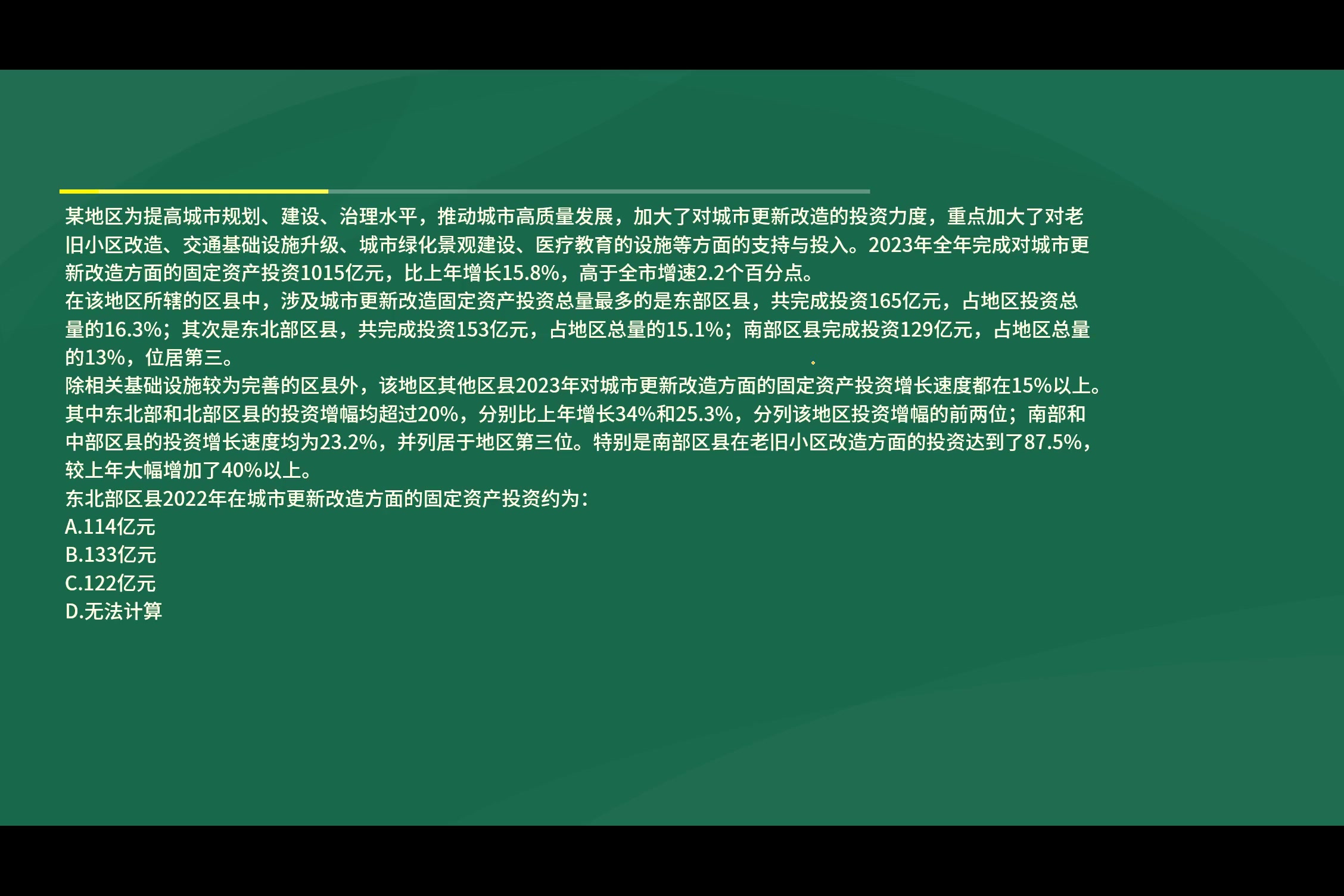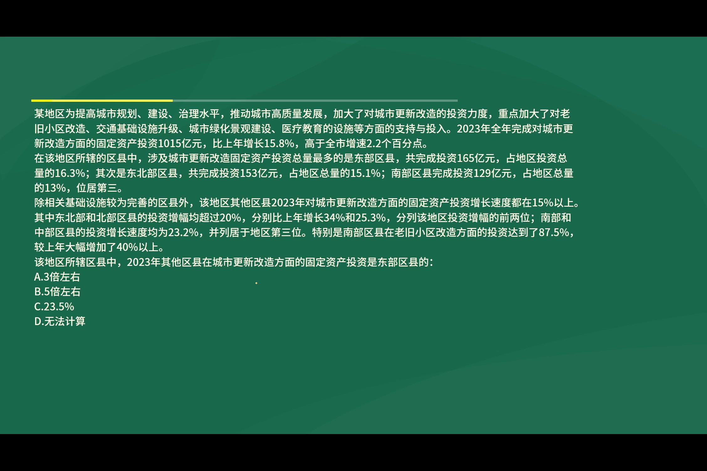 第二步,定位文第二段“(2023年)南部区县完成投资129亿元”和第三段“(2023年)南部和中部区县的投资增长速度均为23.2%……特别是南部区县在老旧小区改造方面的投资达到了87.5%,较上年大幅增加了40%以上”。