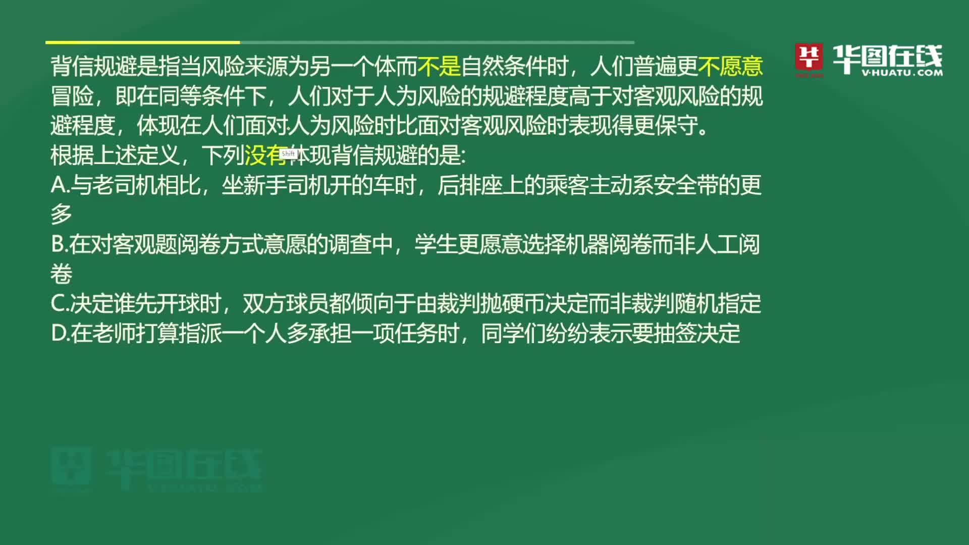 C项:墨菲定律是一种心理学效应。如果有两种或两种以上的方式去做某件事情,而其中一种选择方式将导致灾难,则必定有人会做出这种选择。根本内容是:如果事情有变坏的可能,不管这种可能性有多小,它总会发生。不符合题意,C项不当选。
