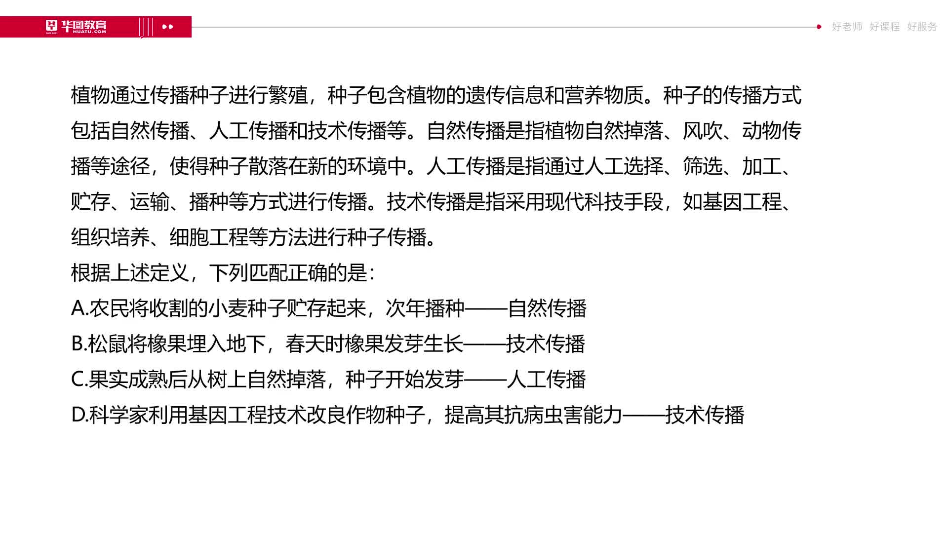 A项:该项描述的是人工对种子进行贮存和播种的过程,符合关键信息②,属于人工传播,匹配错误,排除。