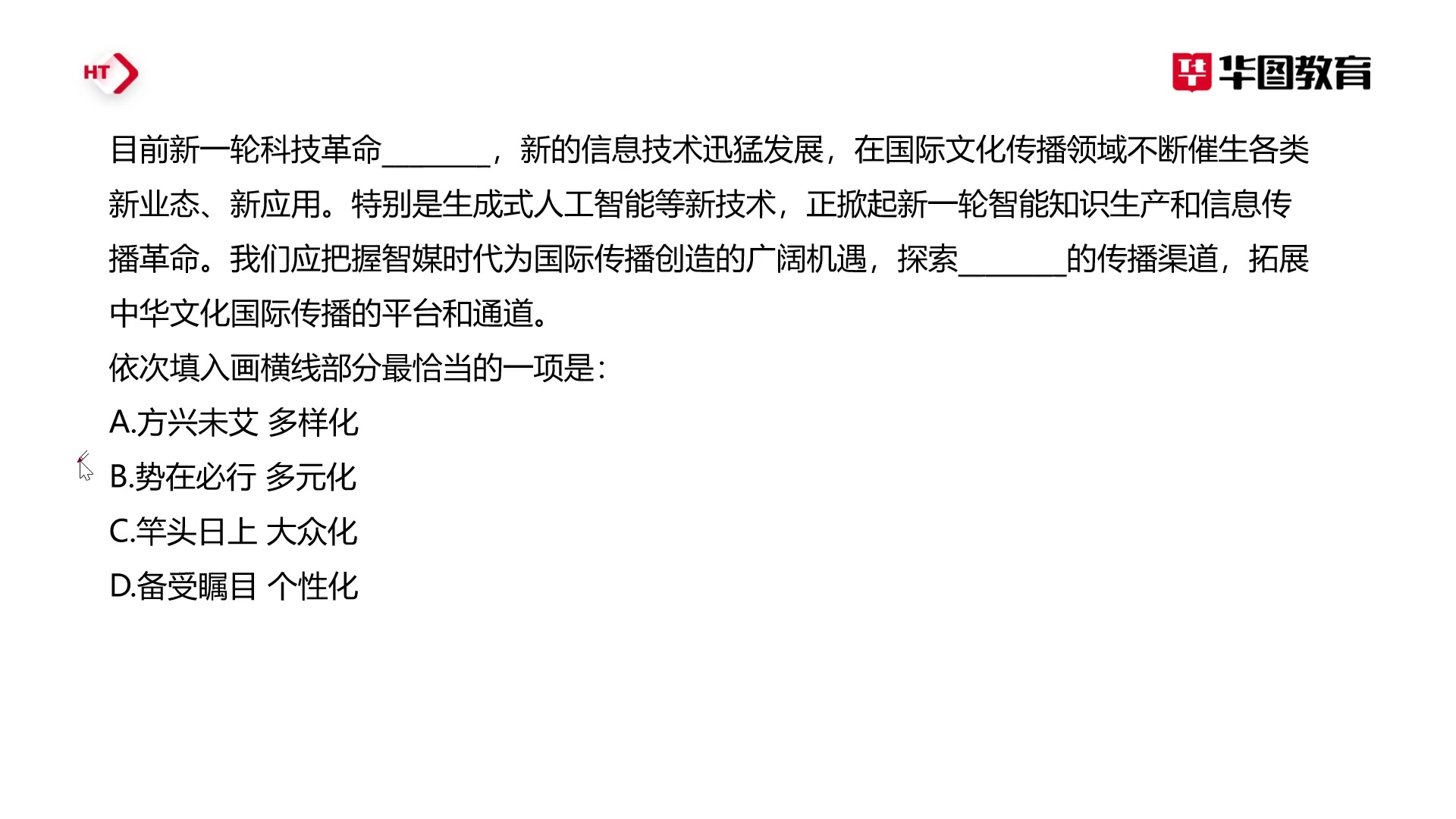 第一步,分析第一空。根据“目前新一轮科技革命________,新的信息技术迅猛发展,在国际文化传播领域不断催生各类新业态、新应用”可知,逗号在此处表并列,横线处和“迅猛发展”相照应,表达的意思是新一轮科技革命正处于蓬勃发展的阶段。