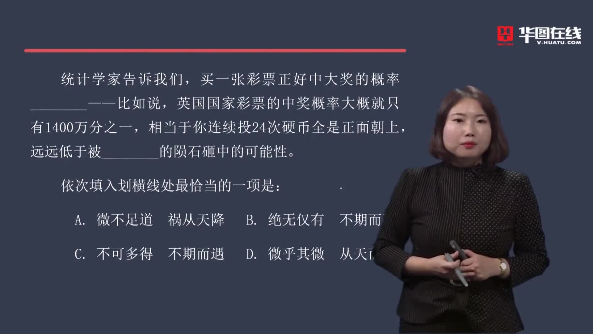 第一步,分析第一空。根据“统计学家告诉我们,买一张彩票正好中大奖的概率________——比如说,英国国家彩票的中奖概率大概就只有1400万分之一”可知,该空表示彩票中奖概率低。A项 “微不足道”指意义、价值等小得不值得一提,强调的是事物的价值、意义方面,而此处说的是中奖概率,并非价值意义,排除。B项 “绝无仅有”意思是极其少有,几乎没有,过于绝对,虽然彩票中奖概率低,但并非绝对没有,选项不符合语境,排除。C项 “不可多得”形容非常稀少,很难得到(多指人才或稀有物品),一般用来形容有价值的东西难得,与 “概率” 搭配不合适,排除。D项 “微乎其微”形容非常小或非常少,用来形容彩票中奖概率低很合适,符合语境。答案锁定D项。