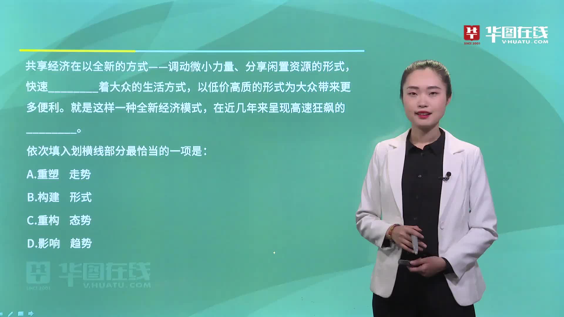 第一步,分析第一空。根据“全新”可知,这是一种与以往不同的方式。A项“重塑”指重新塑造;C项“重构”指重新构建。二者均符合文意。B项“构建”指建立,强调从无到有;D项“影响”指对人或事物所起的作用。二者均不能体现“全新”的含义,排除B项和D项。