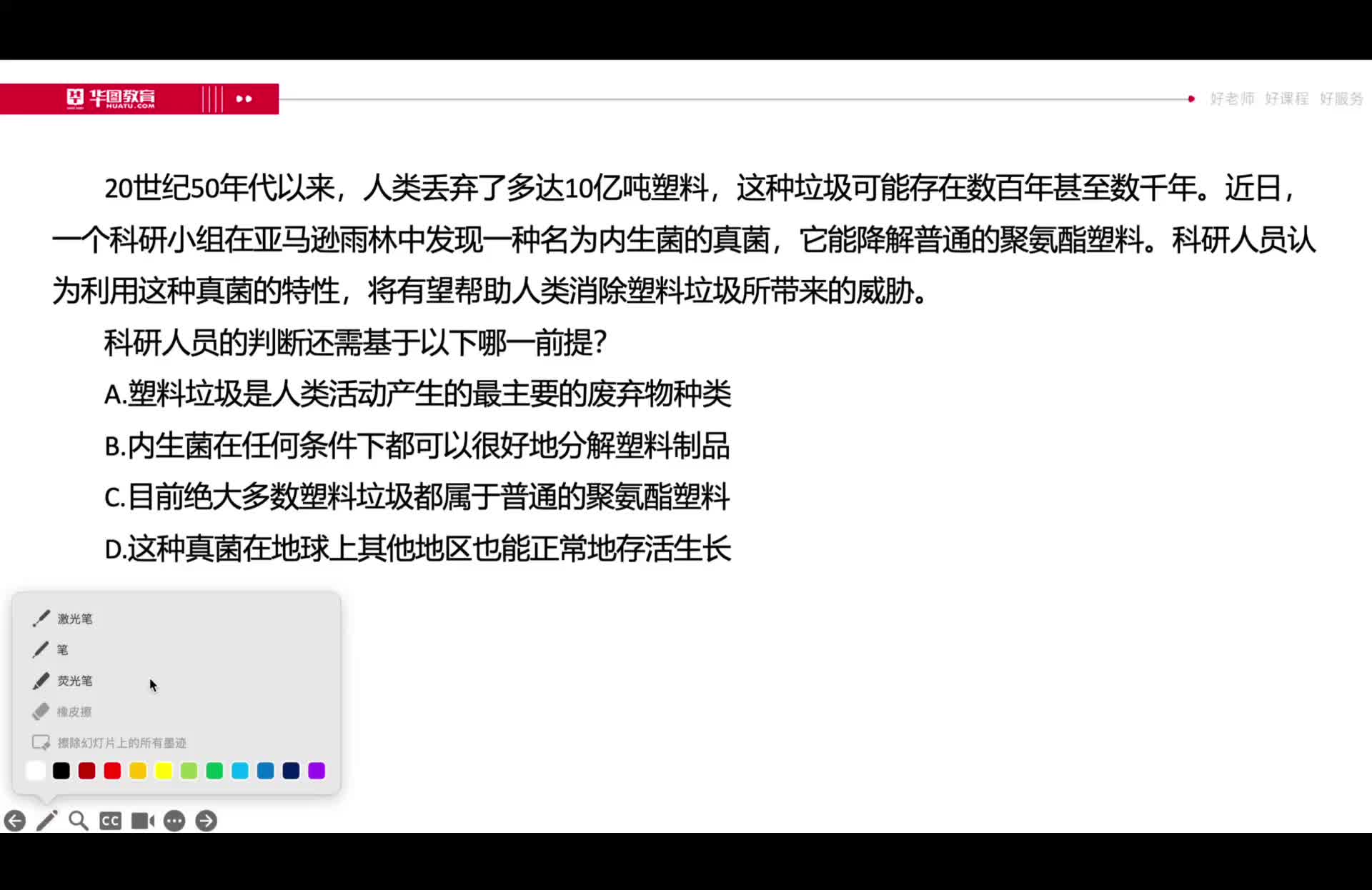 A项:增加论据。说明内生菌确实可以帮助人类消除塑料垃圾所带来的威胁,但不是上述判断需要的前提,排除。