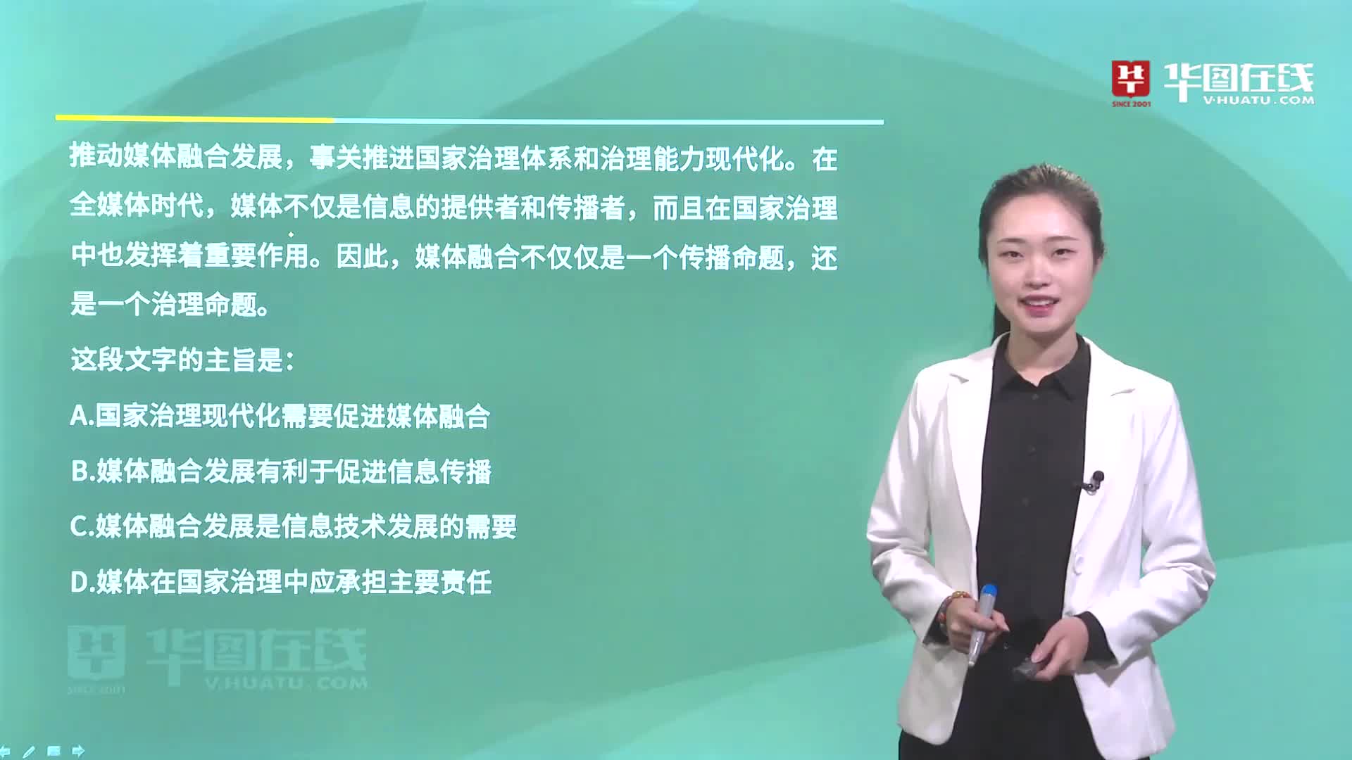 (单选题) 推动媒体融合发展,事关推进国家治理体系和治理能力现代化。在全媒体时代,媒体不仅是信息的提供者和传播者,而且在国家治理中也发挥着重要作用。因此,媒体融合不仅仅是一个传播命题,还是一个治理命题。这段文字的主旨是: