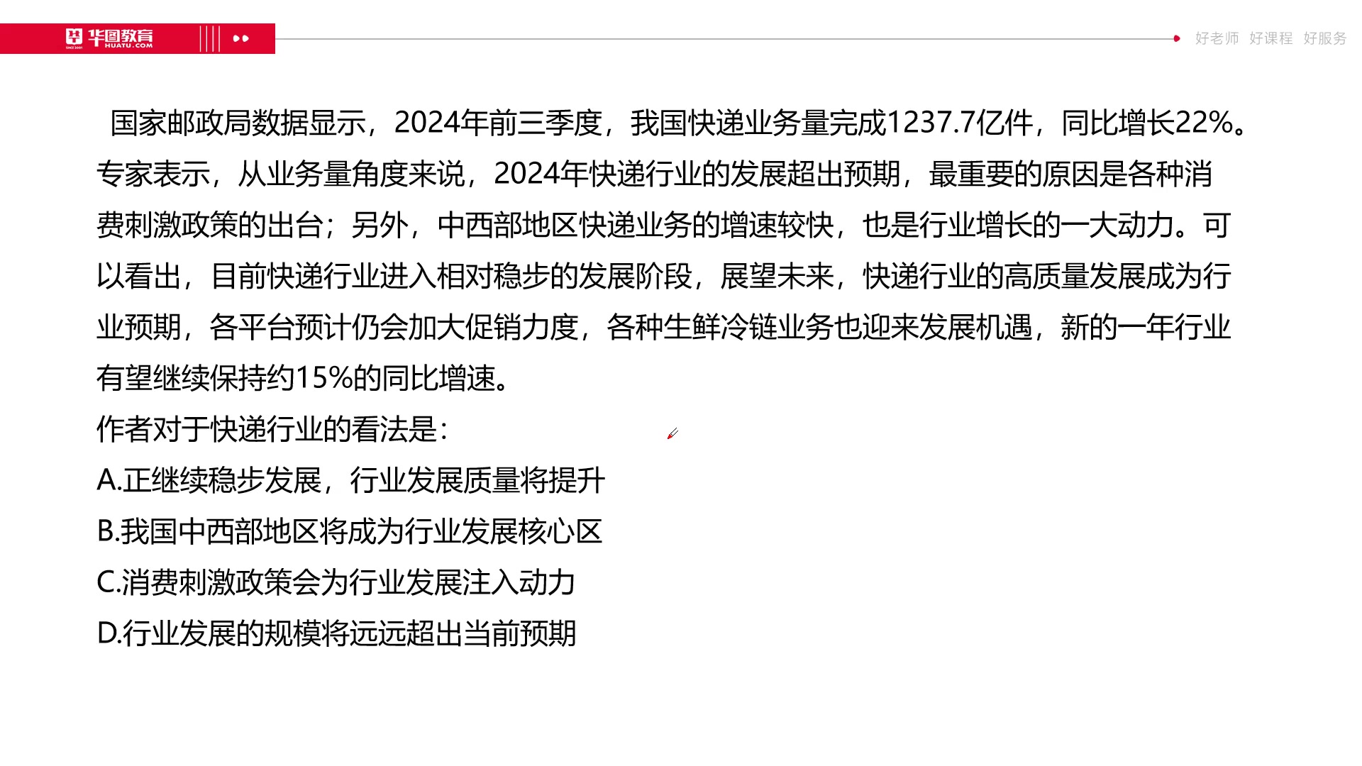 B项:文段中仅专家提及中西部业务增速快是增长动力,无法推出“将成为行业发展核心区”的结论。C项:是专家分析行业增长的原因之一,作者仅客观呈现该观点,并未就此表达看法。D项:是专家基于业务量得出的评价,作者并未认同。