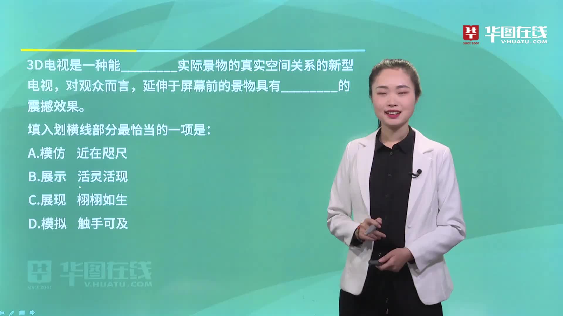 第一步,分析第一空。根据“________实际景物的真实空间关系”可知,填入的词应与“实际景物”搭配。A项“模仿”指照某种现成的样子学着做,电视不能“模仿”实际景物,不符合语境,排除A项。