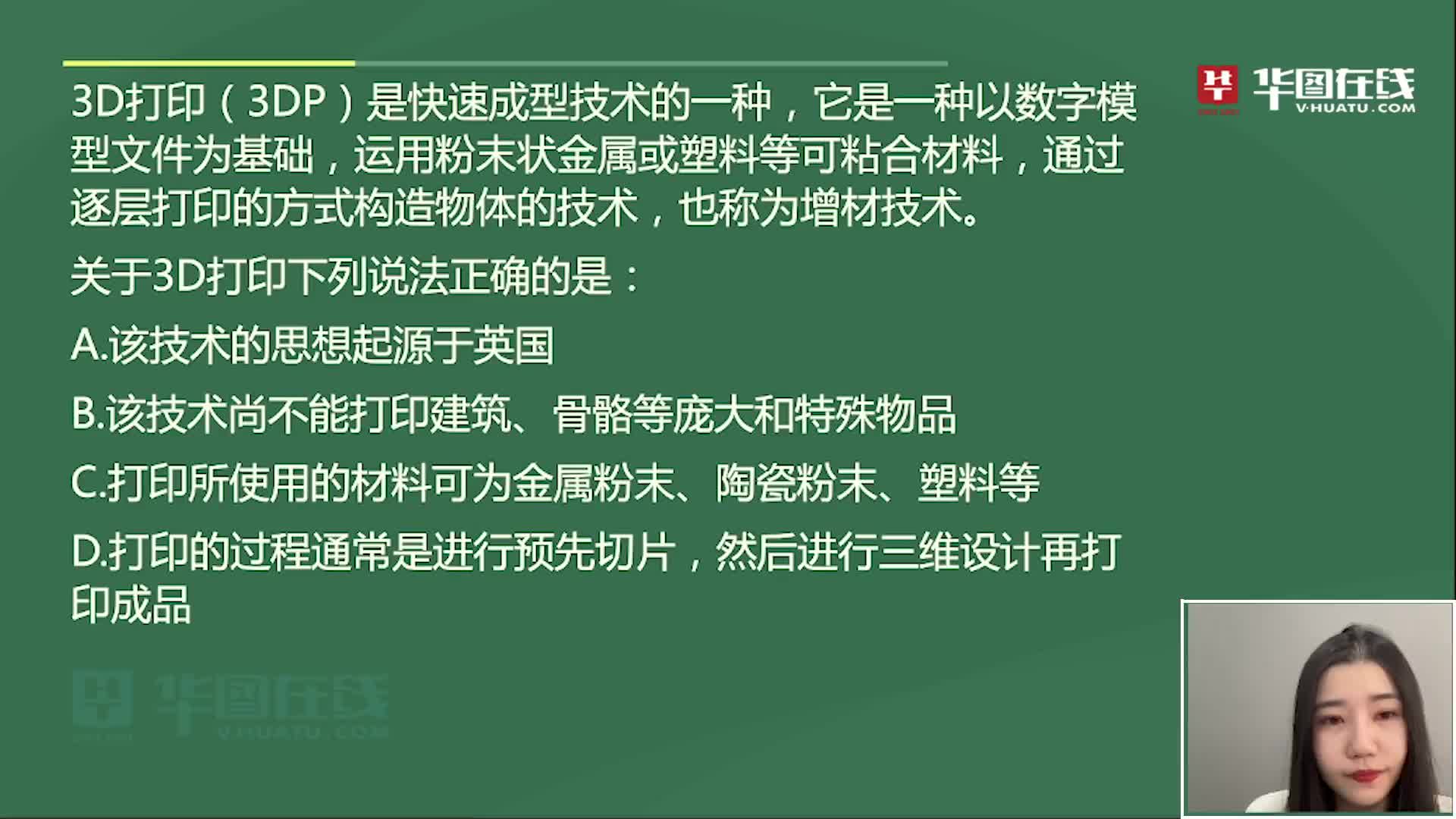 第二步,对比选项。A项“该技术的思想起源于英国”表述错误,3D打印技术思想起源于美国,排除A项。B项“该技术尚不能打印建筑、骨骼等庞大和特殊物品”表述错误,3D打印可以打印这些物品,排除B项。C项表述正确,3D打印的原料可以是“金属粉末、陶瓷粉末、塑料等”,答案锁定C选项。D项3D打印是先三维设计,再切片,然后再打印成品。