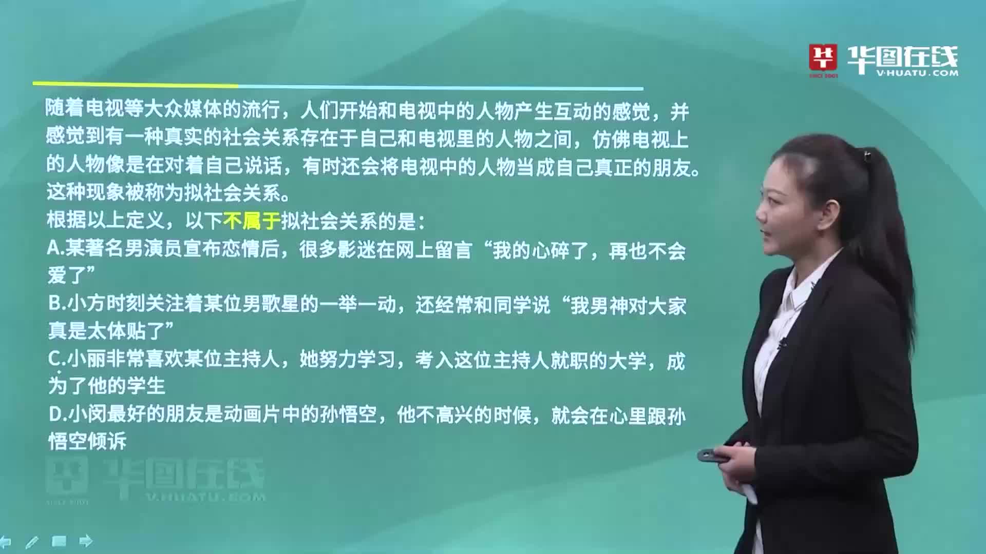 C项:小丽喜欢某位主持人,考入其就职的大学,成为其学生,是一种真实存在的师生关系,不属于“感觉到有一种真实的社会关系存在于自己和电视里的人物之间”,不符合定义;