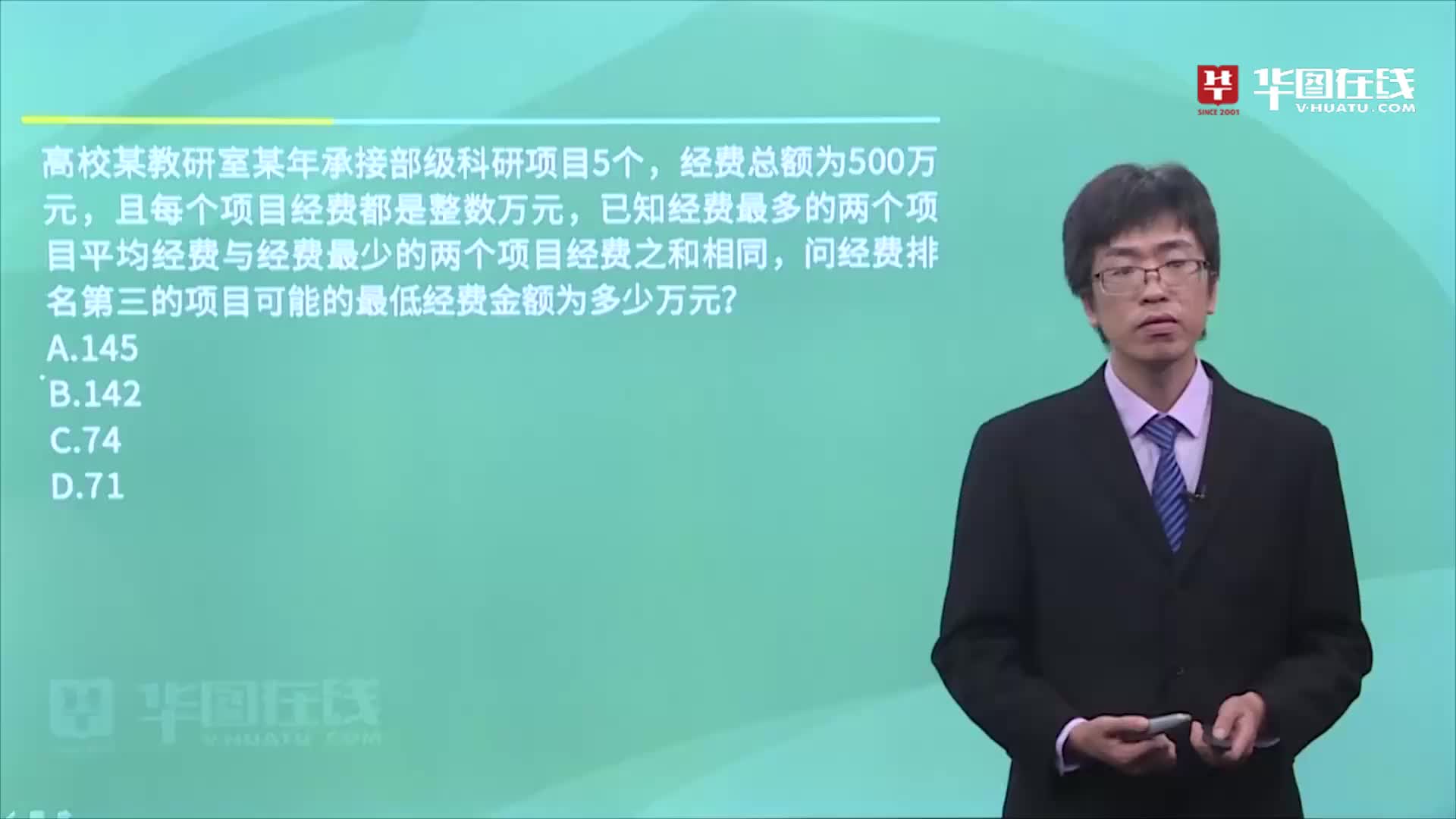 第二步,总和一定,求某项的最值,利用数列构造方法解题。首先把5个项目按从大到小的顺序排列,设问题所求第三项经费为x,要求x最小值,其他项需尽量大,则最后两项均为x-1,则后两项之和为2x-2,前两项之和为4x-4。五项之和为(4x-4)+x+(2x-2)=500,解得x=