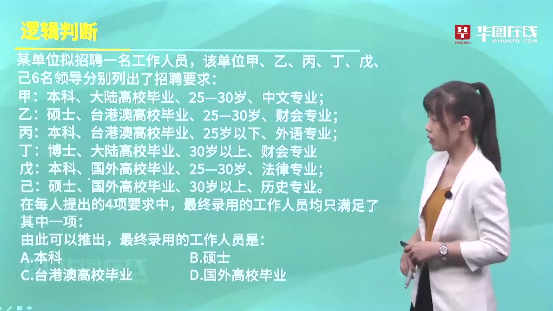A项:观察题干,发现“本科”被提到3次,并且“本科”匹配了“大陆高校毕业”“台港澳高校毕业”“国外高校毕业”三种毕业院校的全部情况,如果录用者为本科,则无法满足题干对于录用者只满足一个条件的要求,因此录用者不是“本科”,A项错误,排除;