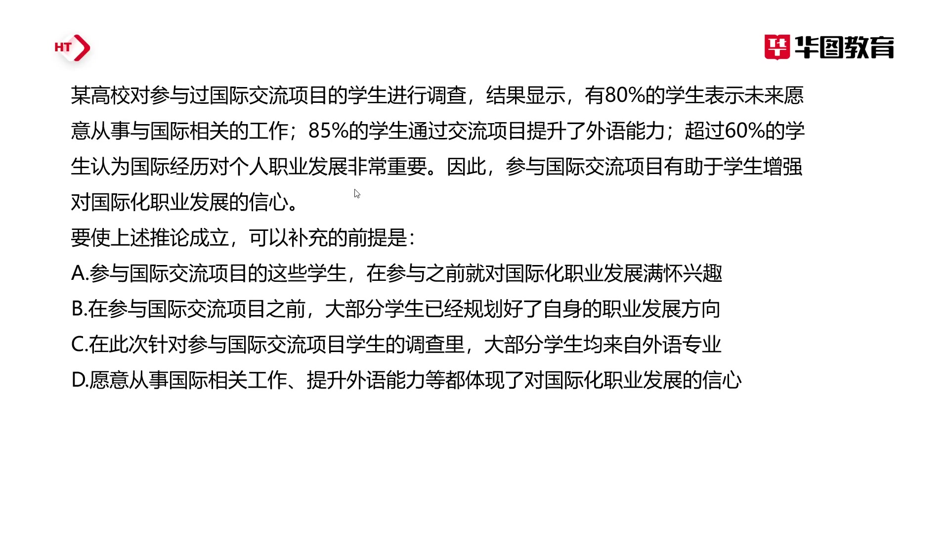 C项:无关选项。该项讨论的是大部分学生的专业背景,与论点“参与国际交流项目有助于学生增强对国际化职业发展的信心”无关,论题不一致,排除。