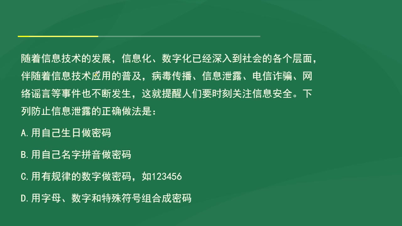 C项:用有规律的数字如 123456 做密码,这类密码过于简单,很容易被破解。C项排除。