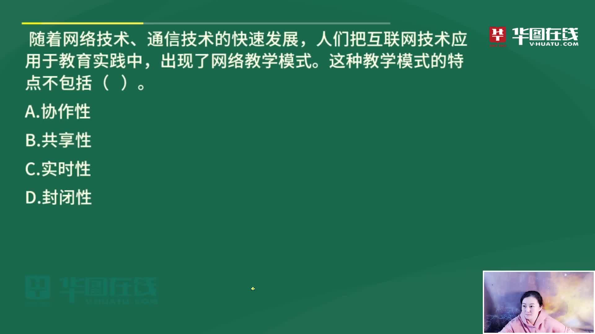 本题考查网络教学模式的特点。随着网络技术、通信技术的快速发展,互联网络在我国日益普及,人们在尝试网络通信的同时,也想到把互联网技术应用于教育实践,于是出现了网络教学模式。这种教学模式的特点主要有:(1)开放性;(2)协作性;(3)交互性;(4)共享性;(5)实时性。因此ABC选项均属于网络教学模式的特点。故本题选D。