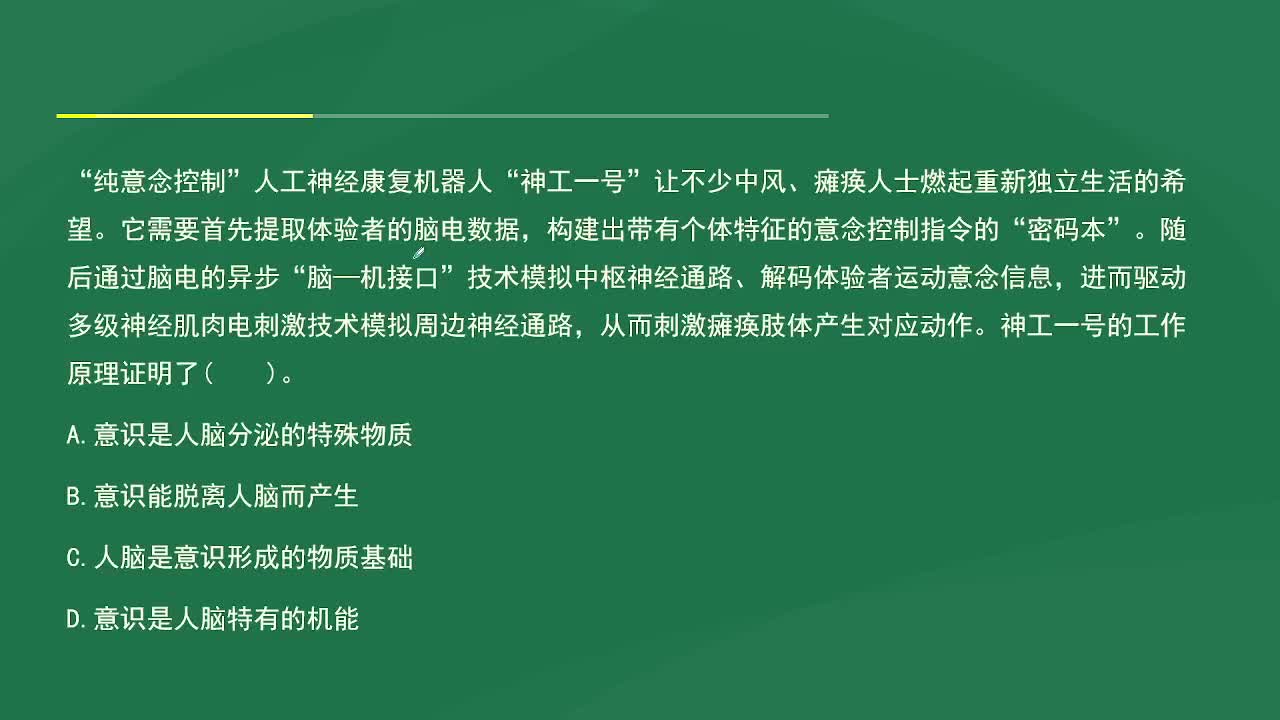 第二步,材料中如果人的大脑皮层受损,中风患者就会丧失思维能力,没有意识,说明人脑是意识的物质器官、物质载体。通过“神工一号”提取体验者的脑电数据,模拟中枢神经通路、解码体验者运动意念信息,进而驱动肌肉神经,体现了人脑的重要性,没有人脑就没有意识,意识是人脑特有的机能。