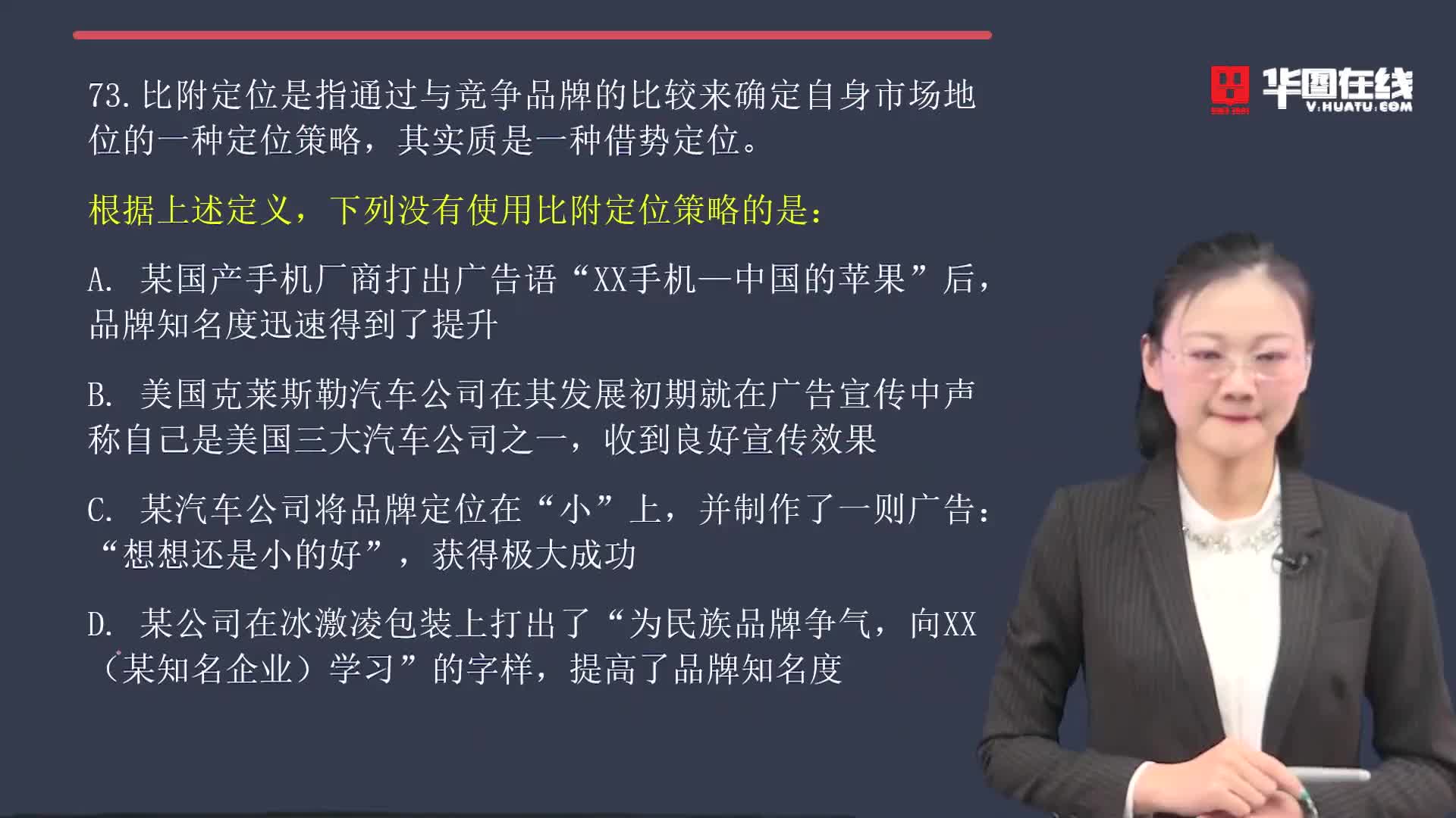 D项:“宁城老窖——塞外茅台”是将自己的品牌与“茅台”做比较,符合“通过与竞争品牌的比较来确定自身市场地位的一种定位策略”,当选。