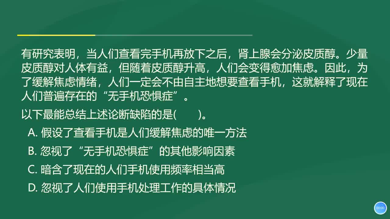 B项:该项提到“无手机恐惧症”的其他影响因素,与论点中的为了缓解焦虑情绪,人们一定会不由自主地想要查看手机无关,不是该论证的缺陷;